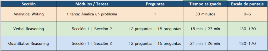 Desde la actualización implementada por ETS en septiembre de 2023, el GRE adoptó un formato más compacto, reduciendo su duración total a aproximadamente una hora y cincuenta y ocho minutos. Esta modificación no implica una disminución en el nivel de exigencia, sino una reorganización más eficiente del examen. La arquitectura sigue siendo rigurosa; simplemente se ha vuelto más concentrada.