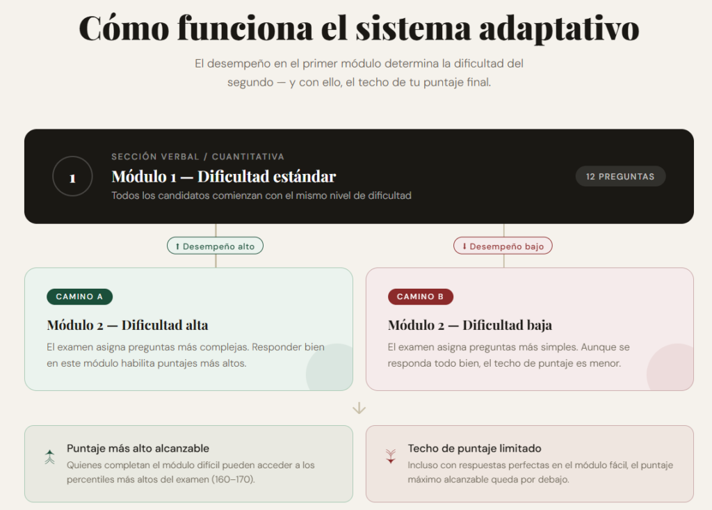 Este detalle tiene implicancias directas en la preparación. No todas las preguntas “valen lo mismo” en términos estratégicos. La consistencia en el primer módulo puede ampliar o limitar el rango de puntaje al que se puede aspirar en el segundo. El puntaje de Verbal se escala entre 130 y 170 puntos.
